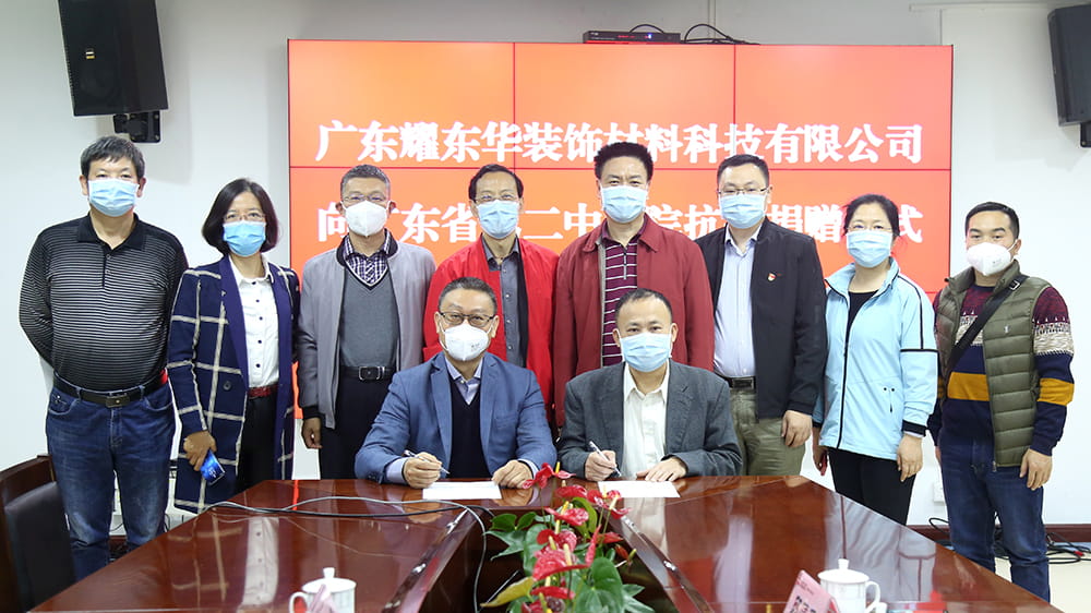 2020年3月6日下午,广东耀东华装饰材料科技有限公司向广东省第二中医院捐赠一批“红棉花”牌抗菌防霉饰面刨花板定制的家具,用于改善医院呼吸科医护人员及病人的环境,共同抗击新肺疫情,捐赠仪式在广东省第二中医院举行。